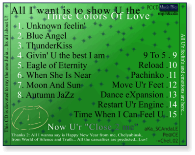 на самом деле, если выскажете свое мнение, будет приятно. я уже не прошу, там, конструктивной критики или предложений итд... все это уже пройденный этап. наверное, самое приятное было придти к кому-нибудь незнакомому в гости (или в общаге) и случайно увидеть в музыкальной папке каталог aka_scandale и записи в плейлисте с тем же именем. делал я все для себя.